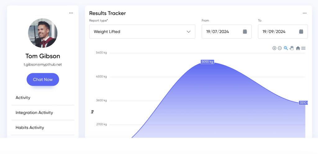 - Result tracker where you can track their weight, body fat, circumference measurements, time spent training, volume, number of completed workouts, and specific exercise performance