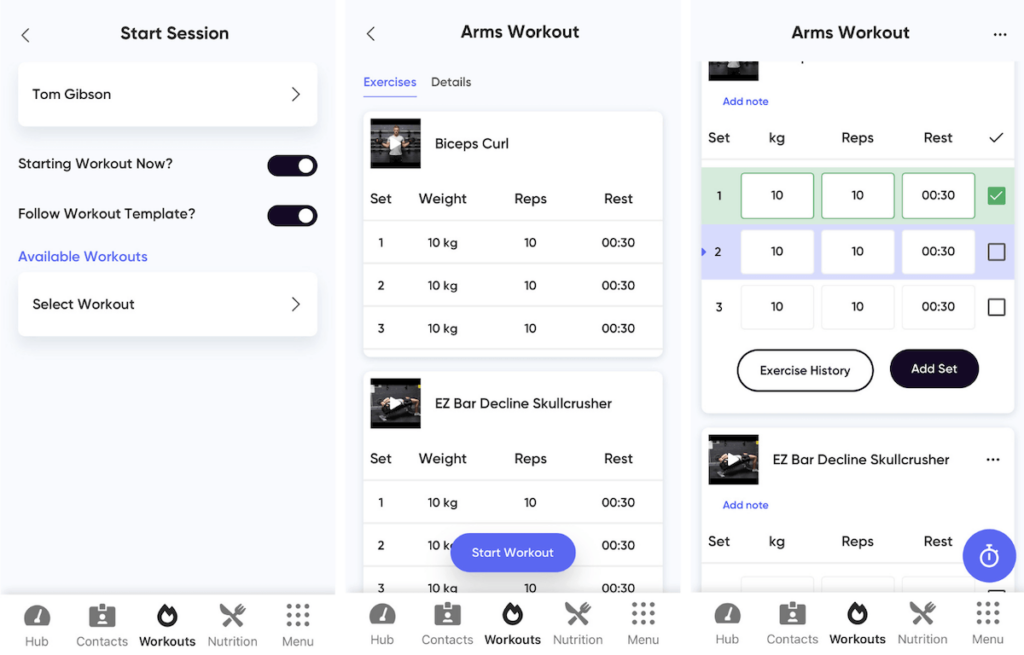 More importantly, you can log workouts for clients while working with them in person. To do so, navigate to Hub, select Start a Workout, pick a client, select the workout for the day, and click Start Workout.