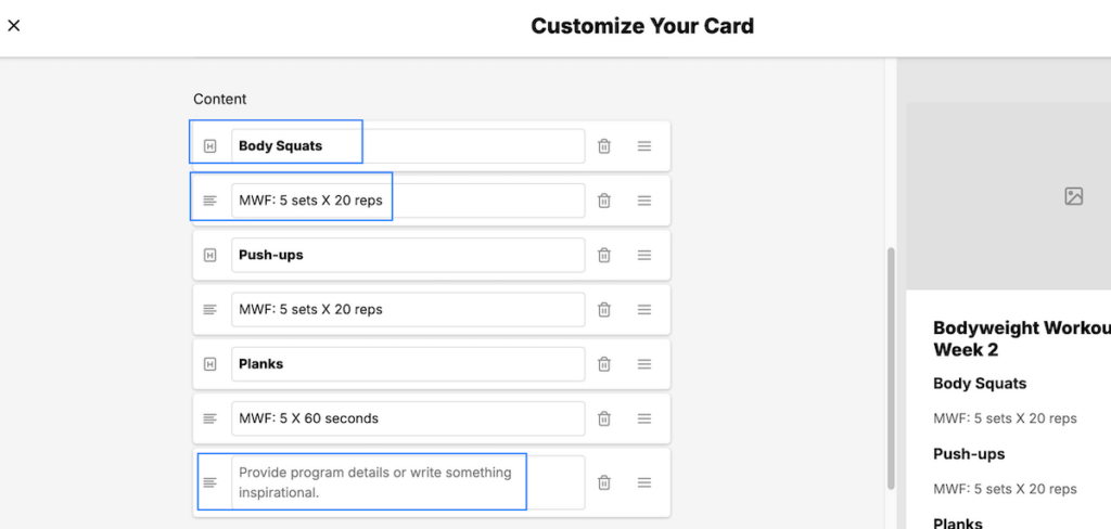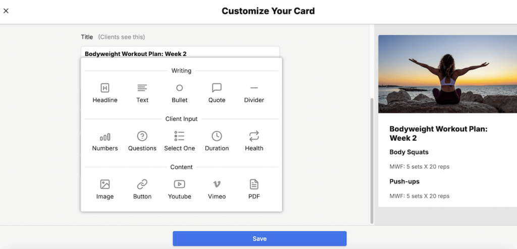 When using cards to build workouts, you must add every detail in free text, which is quite basic. You can add headings for exercise names, text for instructions (like sets, reps, and weight), tips and directions, and YouTube videos for visual instructions.