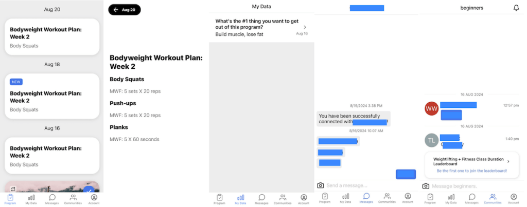 The main areas of the platform are Clients, Messages, Communities, Program Builder, and Business. In these sections, you can access your client list, chat with clients, create groups to organize clients, build and assign workout plans, and use some integrations, such as Stripe, through Zapier.