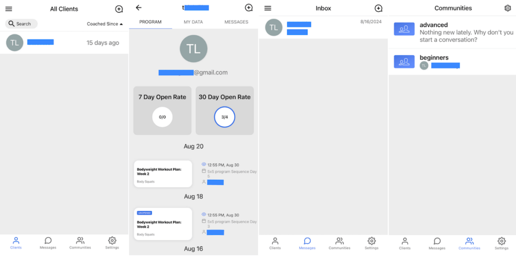 - Clients – this section shows the list of clients. The coach can click on a client to see their training program (as well as open rate in the last 7 and 30 days), their answers to questions you’ve sent, and your direct messages).