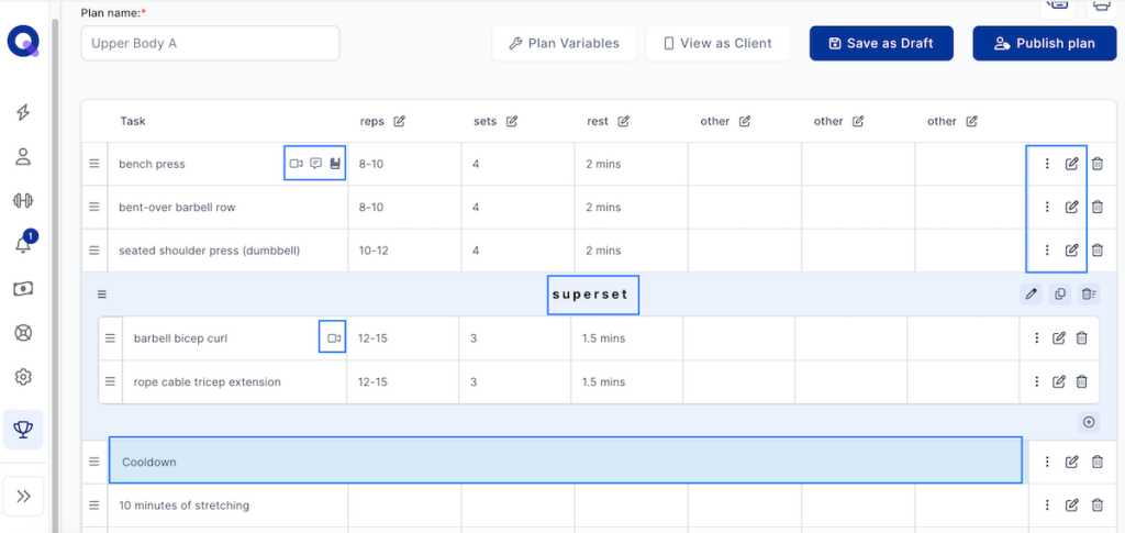 Their take on the workout builder is cool because it’s essentially a spreadsheet with built-in functions like pairing exercises into supersets and merging tabs on a row to create individual sections within a workout.