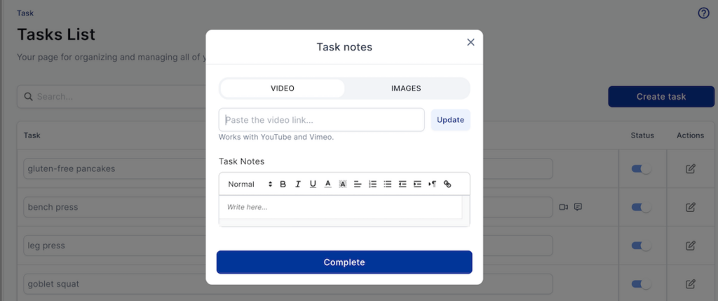 QuickCoach’s response to a library is a task list where coaches can see their saved tasks like exercises, warm-up sequences, stretches, and recipes, or create new ones. To create a new task, start with a name (for example, leg press or a recipe’s name), add a video link, and include instructions in free form.