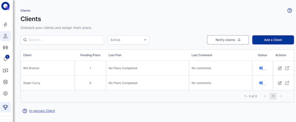 In QuickCoach, this section shows your client list and the number of pending plans (individual workouts) assigned, the last plan completed, and status (active or inactive, which you can change with a toggle button).
