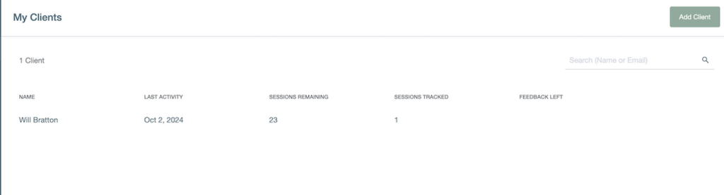 StrengthPortal’s client list shows your clients along with their last activity, sessions left, tracked workouts, and feedback they’ve provided.