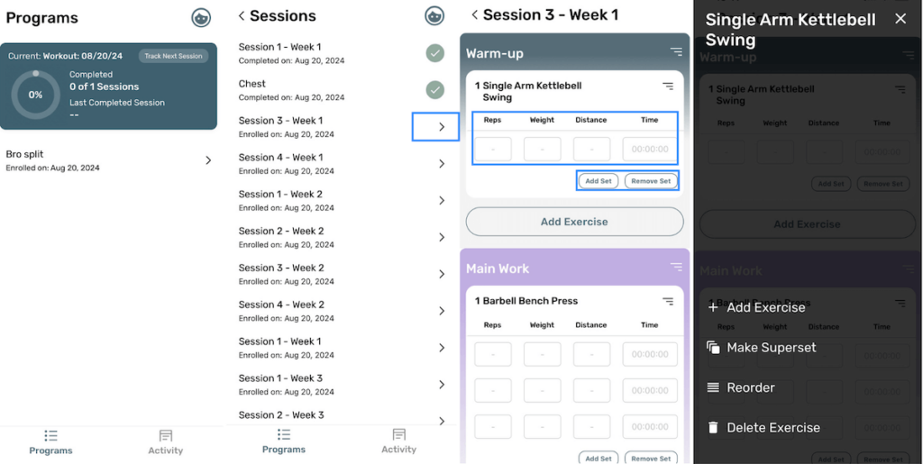 Under Programs, clients can see their assigned training plan and log individual workouts. The client can add or remove exercises and sets, reorder movements, add them to supersets, and log performance on each set: the weight lifted, reps done, distance, and duration.