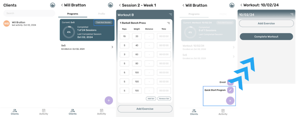 You can also start an improvised workout, build it one exercise at a time, and log it as your client completes each activity.