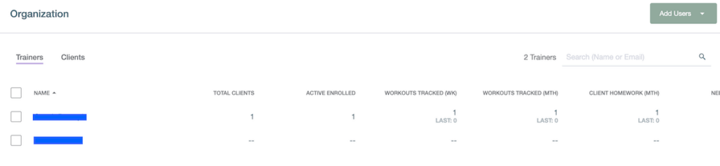 StrengthPortal’s team feature provides some tools to manage a team of coaches and their clients. You can invite trainers to your team and see them under the Organization tab.