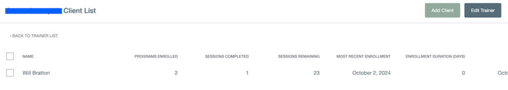 You can click on any trainer on your team to access their client list and see additional information like the number of programs the client is enrolled in, completed and remaining sessions, and last activity date. Click on any client to open their profile.