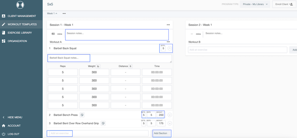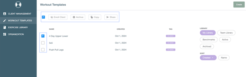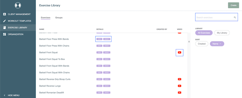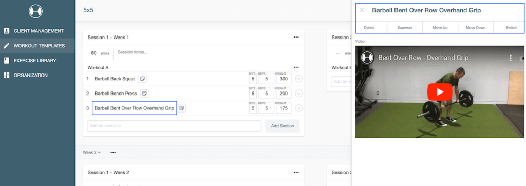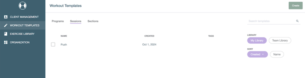 The platform’s main sections are Client Management, Workout Templates, Exercise Library, and Organization. Here, you can access your client list, view all of the programs, workouts, and workout sections you’ve created, access the list of stored exercises, and see all members of your coaching team.