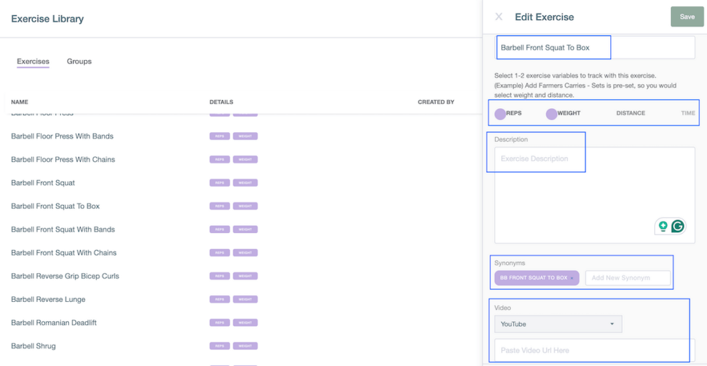 You can click on any exercise to edit the title and add information: type, how-to instructions, attached video, and synonym (a different term you can use to find the movement when building workouts).