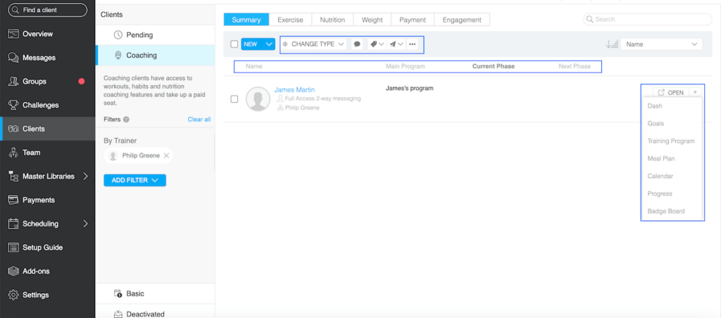 First, clients are listed with their name, training program, progress on the plan (e.g., Week 6 of 8), activity in the last seven days, status, and assigned coach (in case it’s a person from your team).