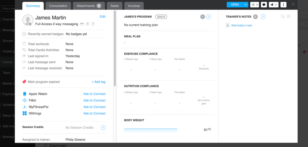 - Summary – basic information on compliance, current program, completed workouts, integrations, client personal information, and notes (only visible to you)