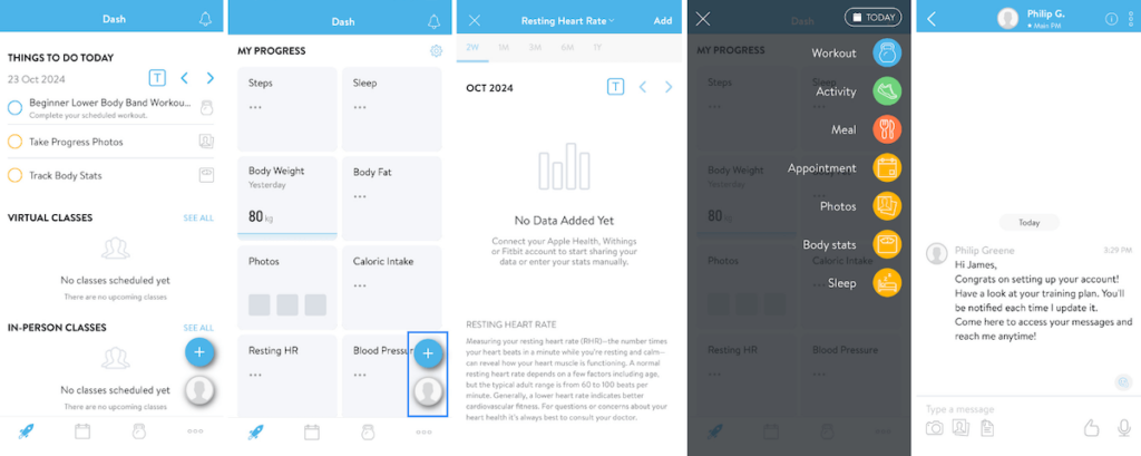 - Dash – the client can see their scheduled workouts, upload progress photos and body stats, connect devices to track daily steps, sleep, resting heart rate, caloric burn, and blood pressure, add and monitor body weight, and track personal bests. The blue + icon on the bottom right opens a menu with options to log a workout, activity, meal, and a few other things. Below that, the client can click an icon with your profile picture to open their chat with you.