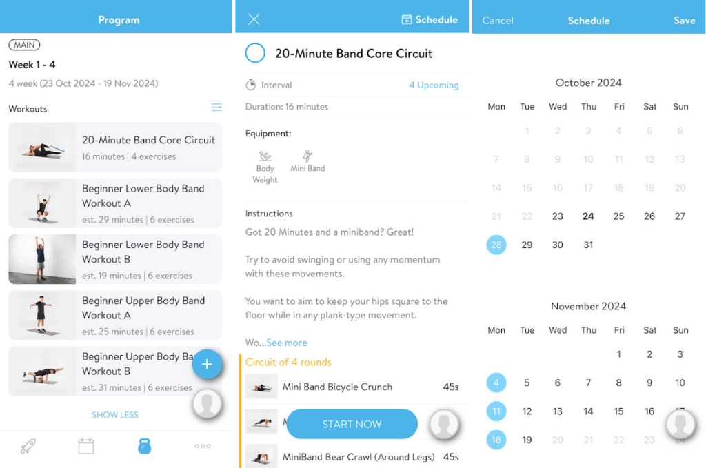 - Program – here, clients can see their assigned training plan and click on the individual workouts for details. Clients can also start any session at any time or schedule them in their calendar.