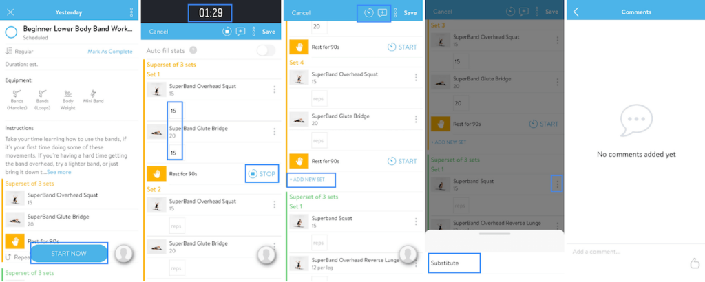 Then, the client can log the number of sets and click the START button next to a rest period you’ve scheduled for the timer to start. Your client also has the option to substitute an exercise, add extra sets, use the built-in stopwatch (icon on the top), and leave comments for the workout.