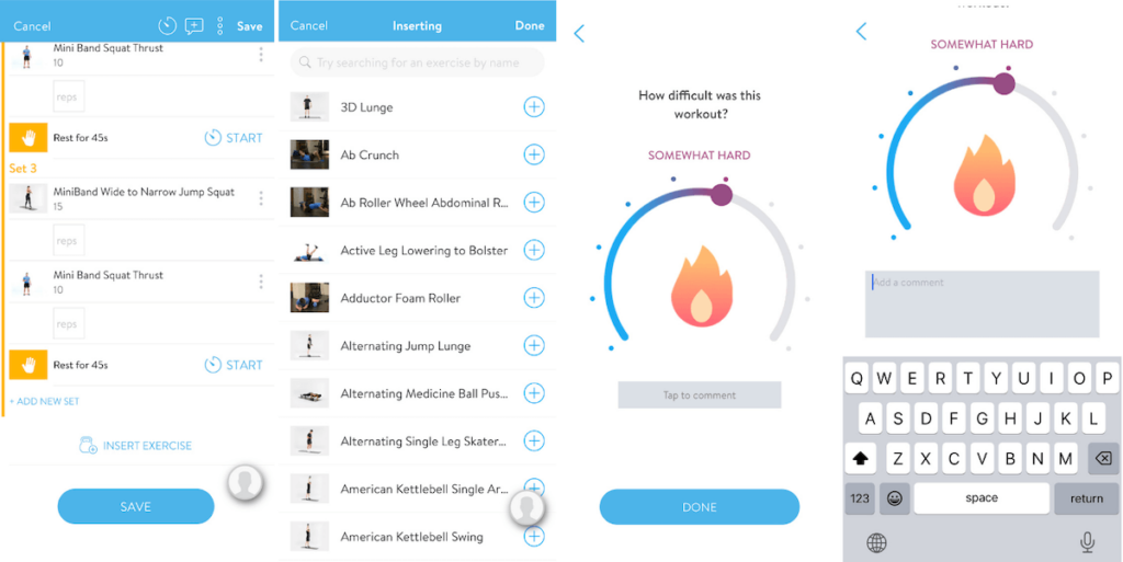 Clients can also insert additional exercises into any workout. Before marking a session as complete, clients are prompted to rate the session’s difficulty with an option to leave feedback.