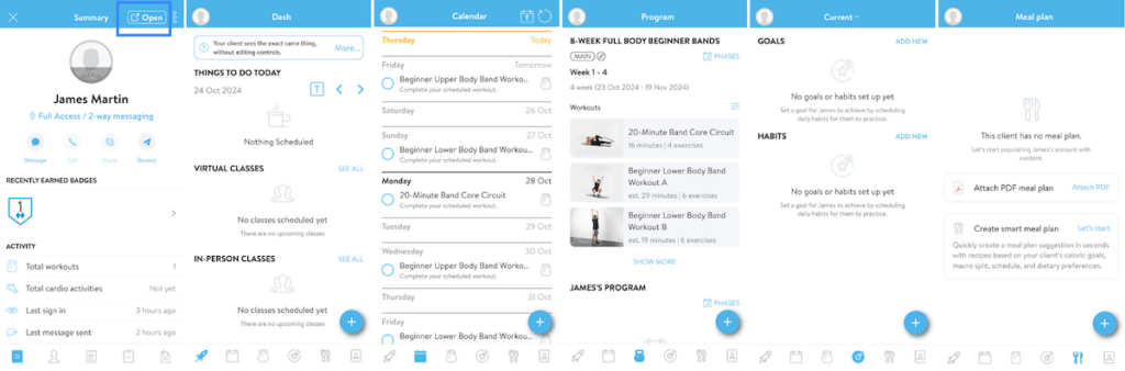 Doing so opens the app from the client’s point of view, where you can access their dashboard, calendar, program, goals, and meal plan section.