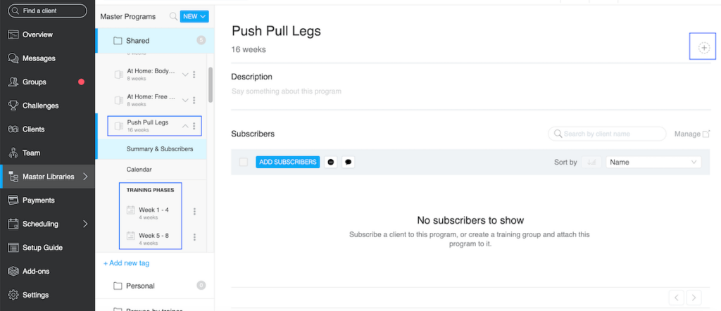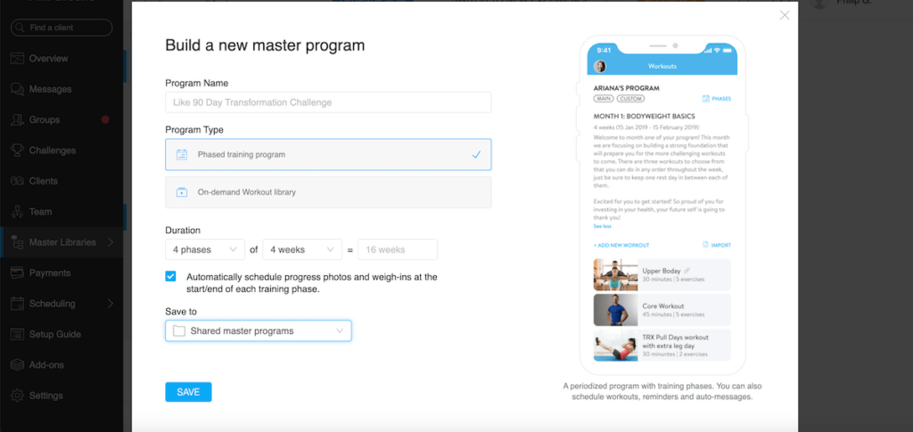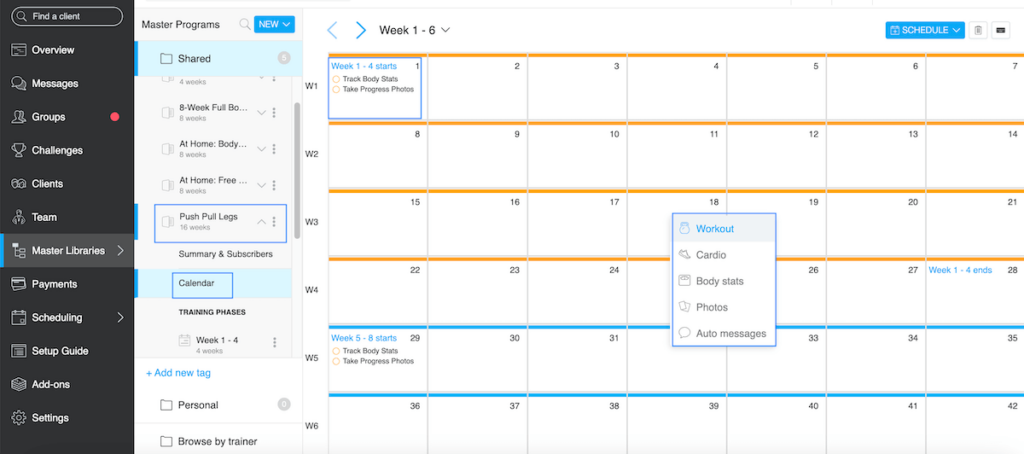 Like other areas on Trainerize, the program library is detailed and offers many options for adding, scheduling, organizing, and building training plans. You can build new programs from scratch, choose a duration, and select where to save it, among other options.