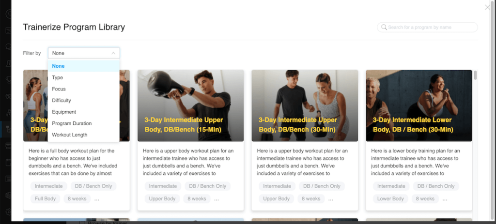 Trainerize also has a rich program library you can browse and sort by type, focus, difficulty, and other criteria. Click on the results to see details and import any program to your library to adjust and assign to clients.