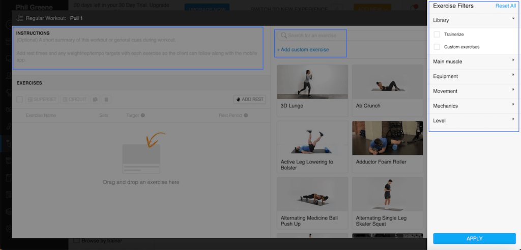 Like on other platforms, you can add a description or additional instructions at the top. The exercise library is on the right, and you can use the built-in filters to narrow the search results.