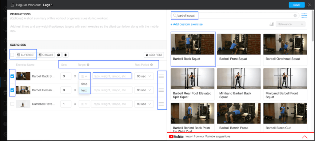 The search results are mostly relevant, even when using simple terms like barbell squat with no filters. You can use drag-and-drop functions to add movements to the workout and then input variables for clients, such as the number of sets, weight, duration, tempo, and rest period.