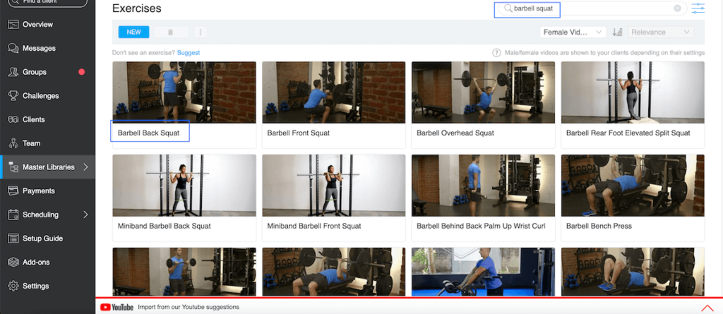 Hevy Coach has a smaller but curated and more relevant library for personal trainers and strength coaches. This means you can quickly find the right movements with basic search terms without even using the filters for muscle targets and equipment: