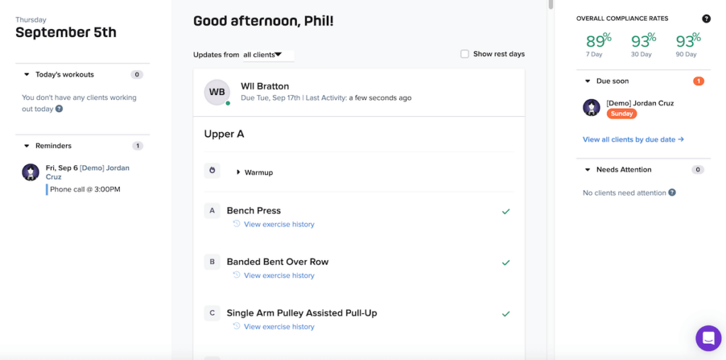 TrueCoach has a sleek, albeit slightly cluttered interface that takes some time to figure out and get used to. As you log in, you’re presented with a dashboard that shows a list of clients with workouts scheduled for today, among other helpful information.