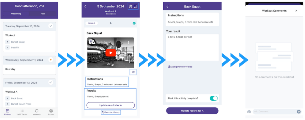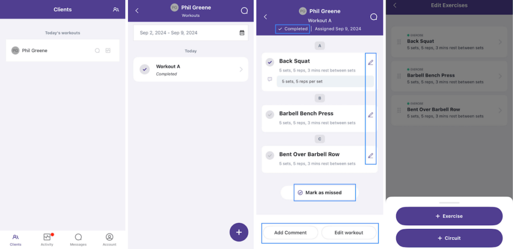 | Coach App | Track your clients’ progress, log workouts for them, and communicate through the built-in chat. | Monitor the workouts you’ve prescribed, edit details, mark sessions as complete or skipped, and chat. |