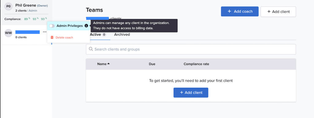 Navigate to the Teams section to add clients and coaches. Once you add other coaches, you can assign clients to them, click on their profiles to see their client list, and give them admin privileges to manage all clients in the organization.