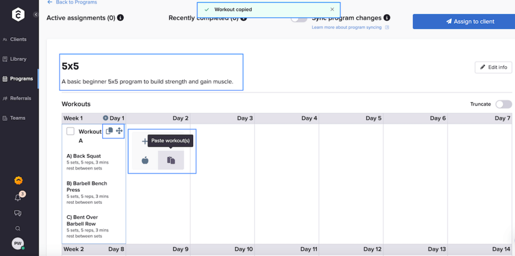 Like TrueCoach, you see all your saved programs with options to duplicate or assign them to clients. However, you also see the individual workouts that are part of the plan at a glance and can organize the programs in folders based on client goals, experience, available equipment, and other factors.