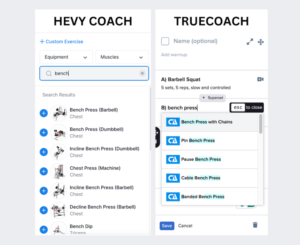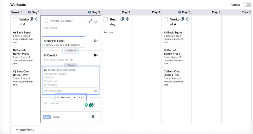 | Workout Builder | Add movements from the library, fill out the training variables (e.g., load, reps, RPE, and rest period), add or remove sets, create supersets, and more. | Add multiple weeks and schedule workouts. Write the exercises and training variables in free text with options to create supersets and add circuits. |