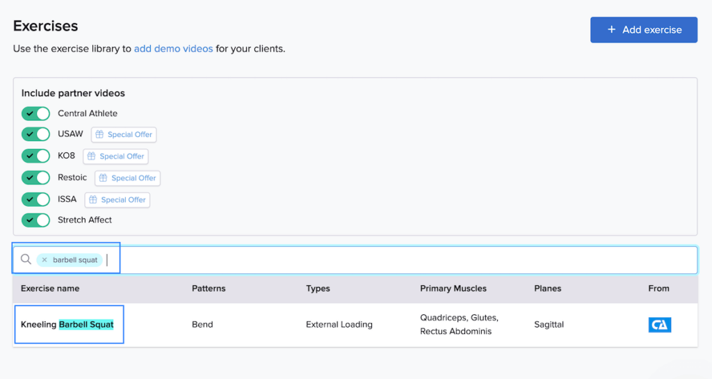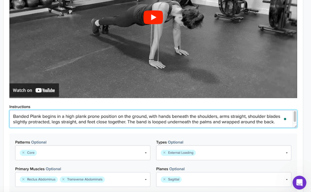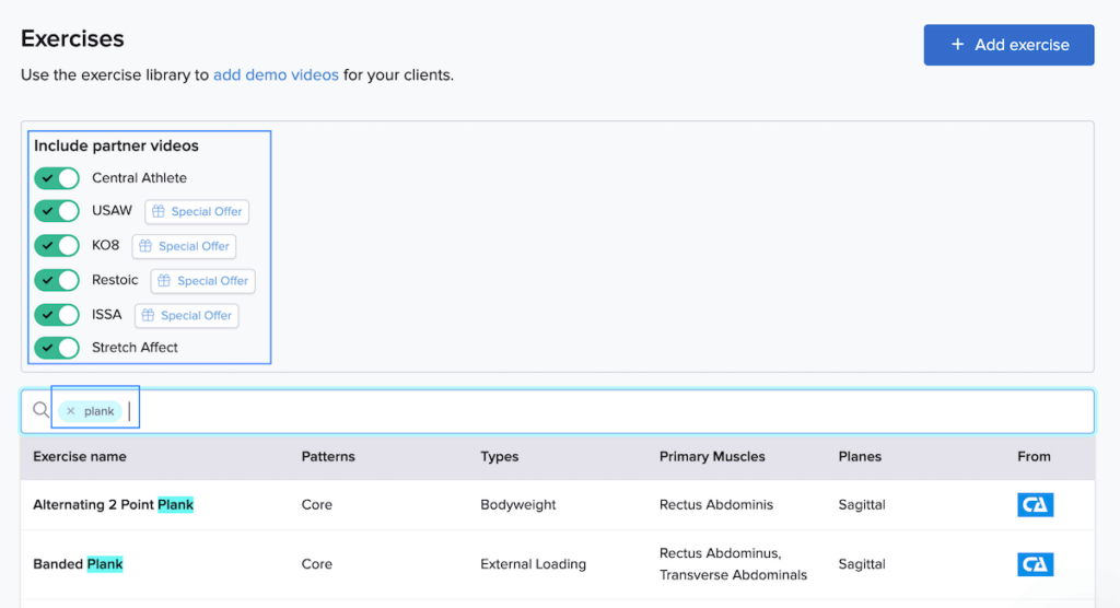 TrueCoach has an extensive exercise library with hundreds of movements and even more variations. A simple search for ‘plank’ shows dozens of variations, each with a video from one of their partners like Central Athlete and USAW.