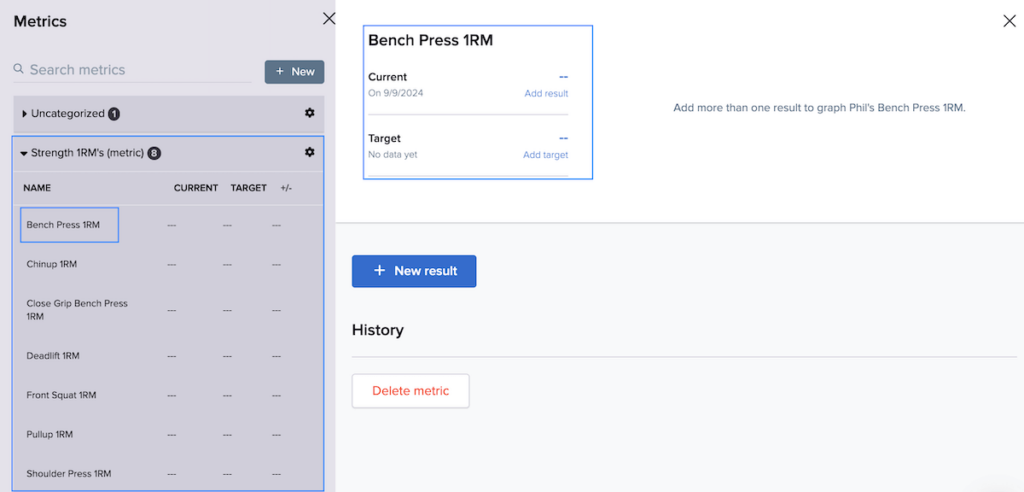 You can also assign metrics from the library. These groups of metrics apply to different training types and goals, such as Strength 1RM.