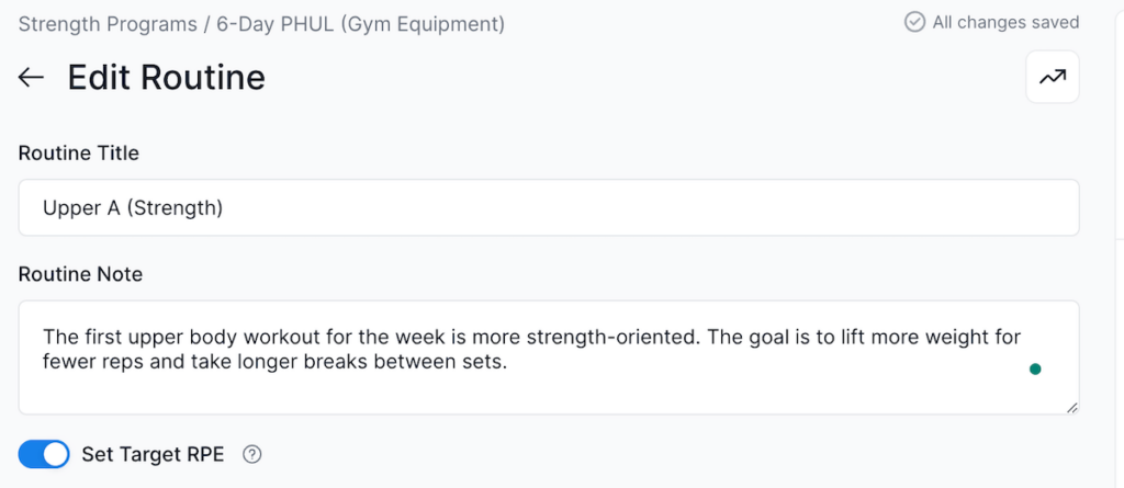 First, as you start editing a workout or building one from scratch, you can add a routine note and enable RPE.