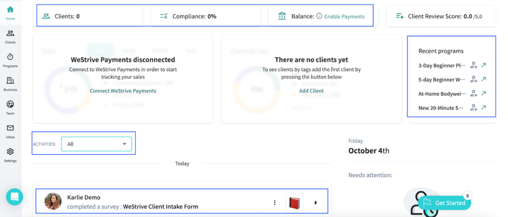 Its dashboard is also clean and informative. It displays the number of clients, their compliance percentage, payment balance, recent programs, clients that need attention, and your clients’ recent logged activities on a dashboard.