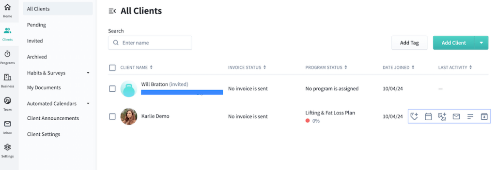 You can mouse over to the right of each client for additional options: add/remove a tag, go to their calendar, assign a program, open the chat, navigate to your notes, or archive the client.