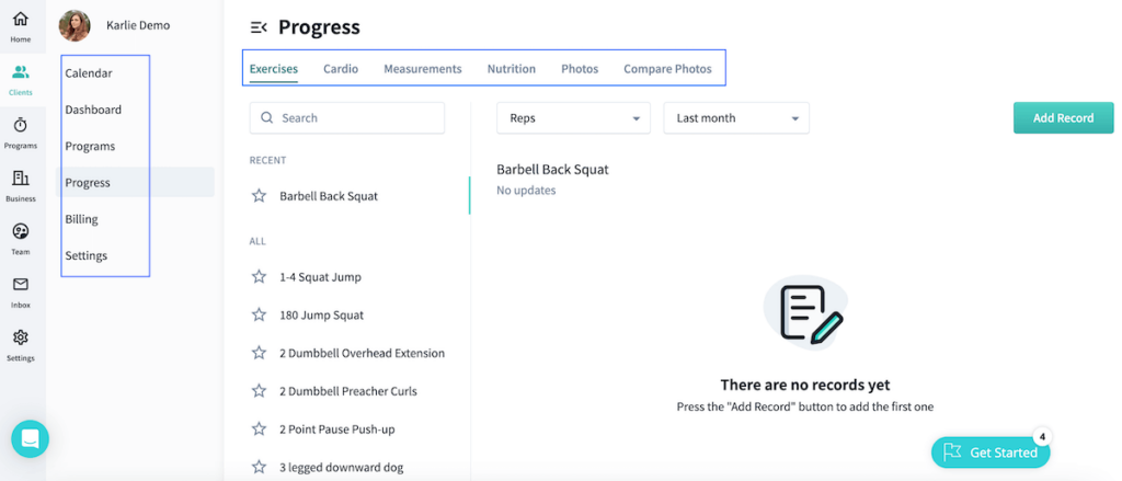 - Progress – track your client’s progress on individual exercises, cardio performance, body measurements, heart rate, blood pressure, nutrition, and progress photos