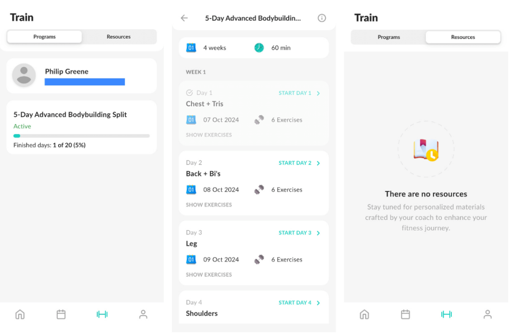 The client can see who their coach is, examine the training program assigned by them, and browse through shared resources.