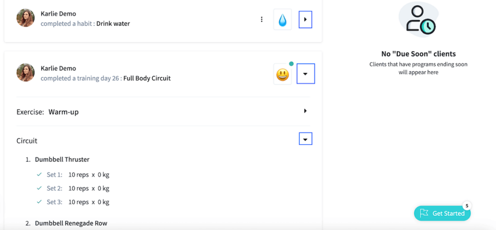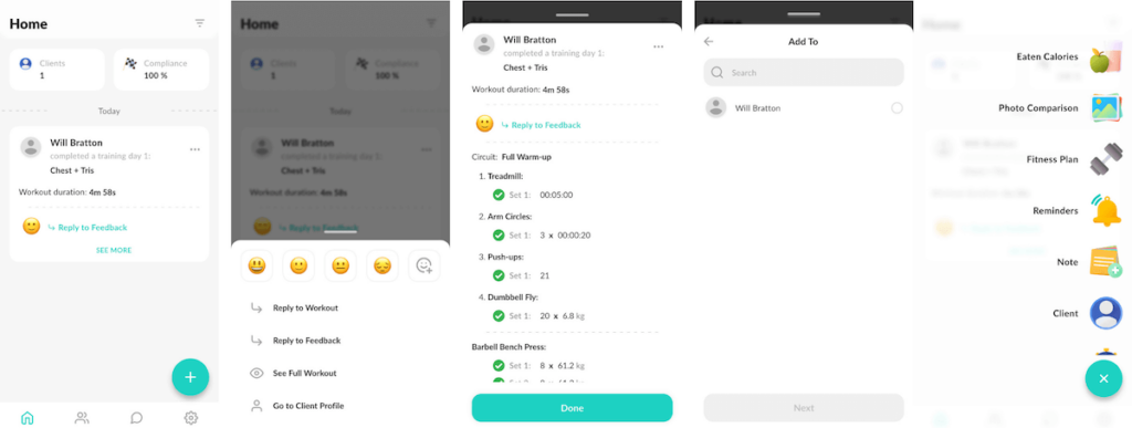 It displays the number of clients, compliance rate, recent logged activities, and feedback/rating. You can click to see the entire workout and reply to your client’s session or feedback.