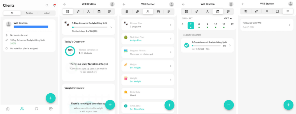 Click on each client to visit their profiles for an overview of their training, body weight, nutrition, and calendar. You also gain access to the notes you’ve written in relation to that client, along with their progress photos, measurements, goals, limitations, and available equipment, with an option to edit each.