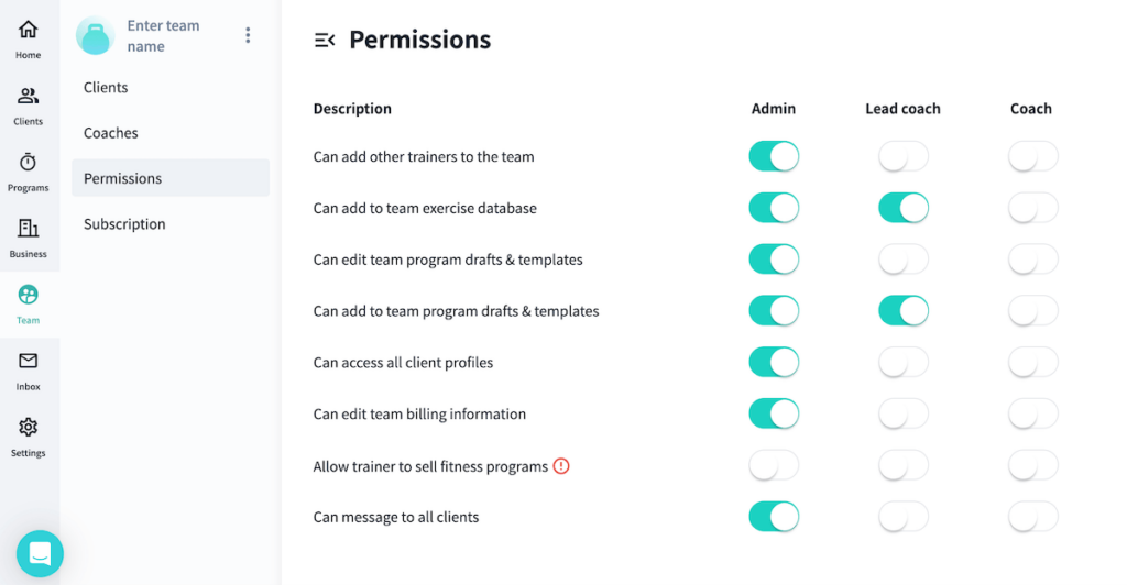 WeStrive allows you to team up with other fitness professionals. You can invite other members, assign a role (Admin, Lead Coach, or Coach), and adjust the permissions of each role.