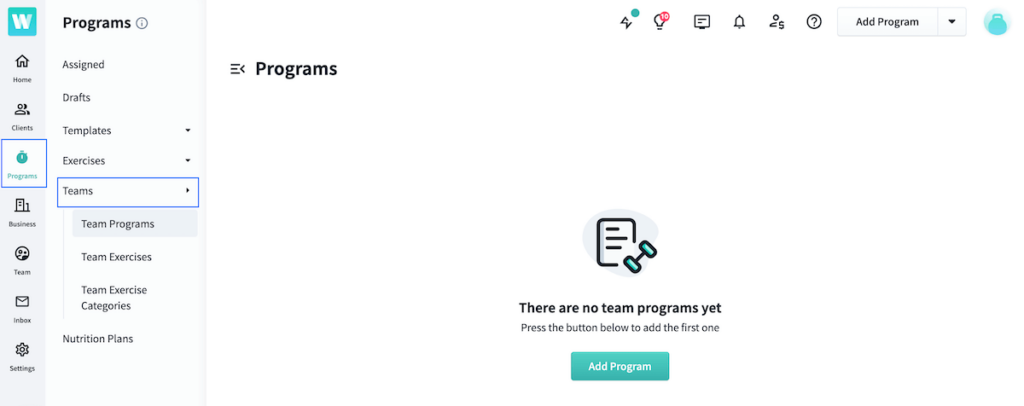 One advantage of the team feature is that you can share resources like programs and exercises. To do so, navigate to the Programs tab and select Teams to open the sub-menu: