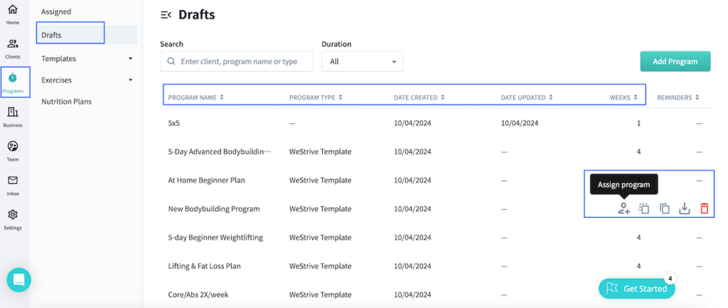 You can create and store unlimited training plans in WeStrive’s program library. Each plan is listed with its name, date of creation and last update, and duration. You can mouse over on the right of each plan to reveal additional options: assign, duplicate, download as PDF, or delete.