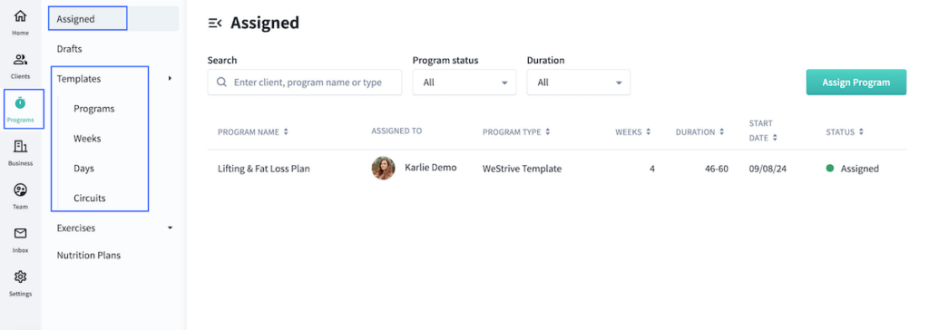 - Program – see your client’s past, current, and future assigned programs and click on any of them to edit
