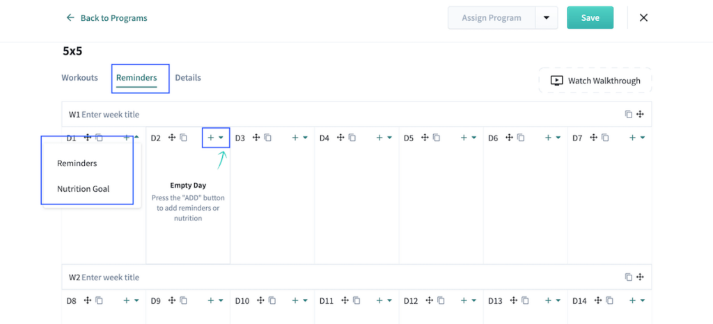 You can also navigate to the Reminders section to assign tasks (such as uploading progress photos) or set nutrition targets.