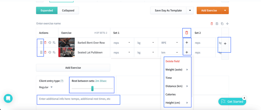 While logging a workout, your client can add, remove, and rearrange exercises, add and remove sets, mark sets by type (normal, drop set, to failure, and warm-up), log RPE per set (if you’ve enabled it), and write a custom note for any exercise.