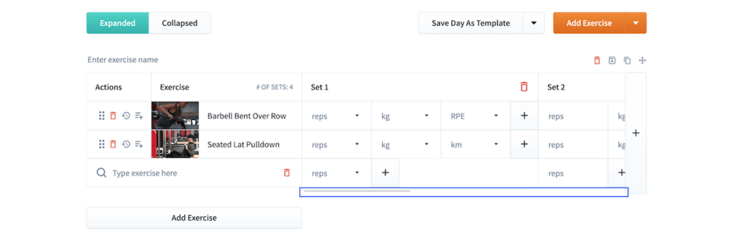 | Workout Builder | Add movements from the library, add/remove sets, assign training variables, write custom notes, and create supersets. | Add movements through a search field, add or remove sets, add multiple variables to each activity, and write custom notes. |