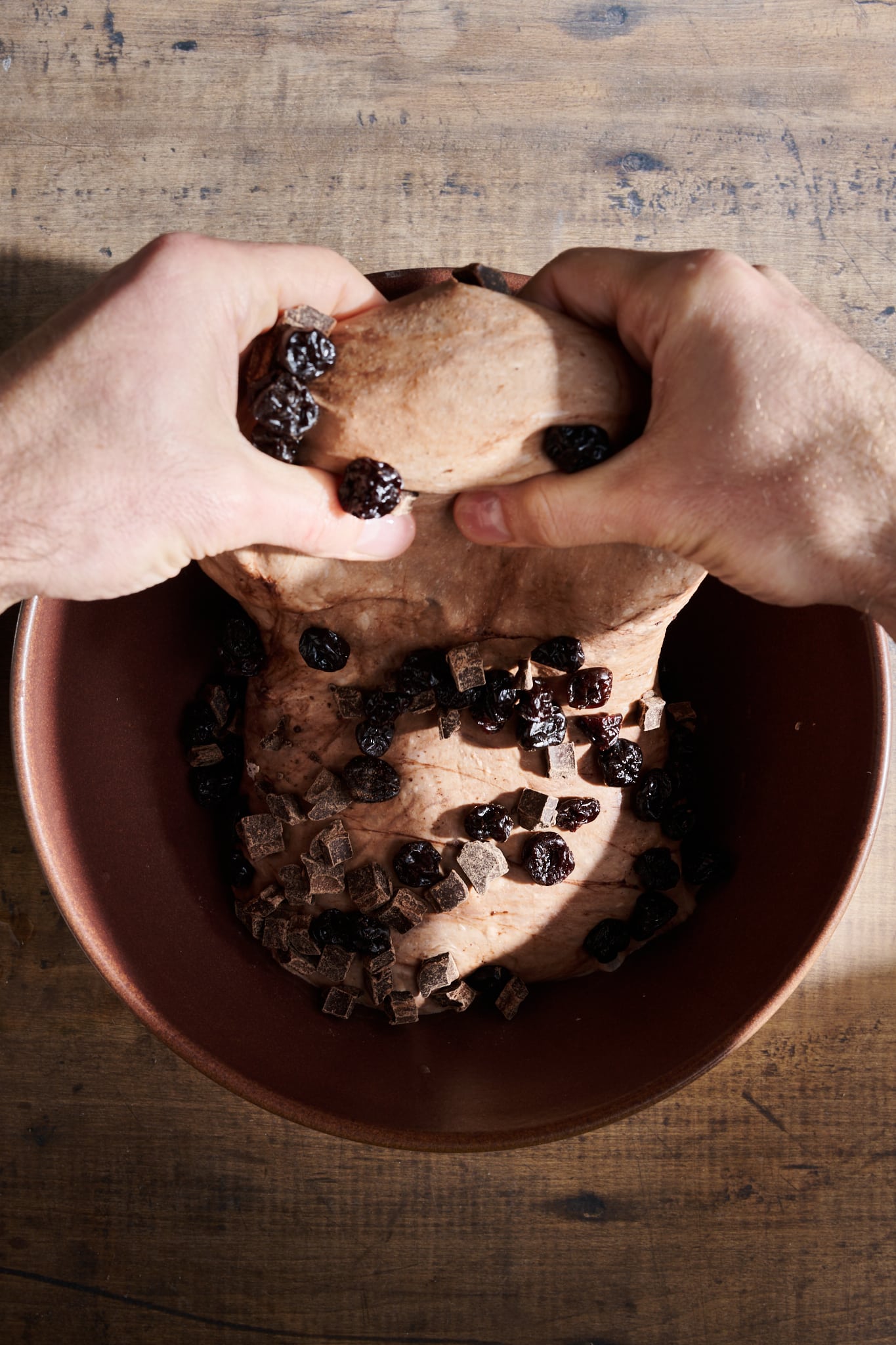 To reduce burning on the exterior, if you see any pieces of chocolate or cherries hanging onto the top or sides of the preshaped rounds, pluck them out and put them under the dough (which will end up being the inside of the loaf when you bake).