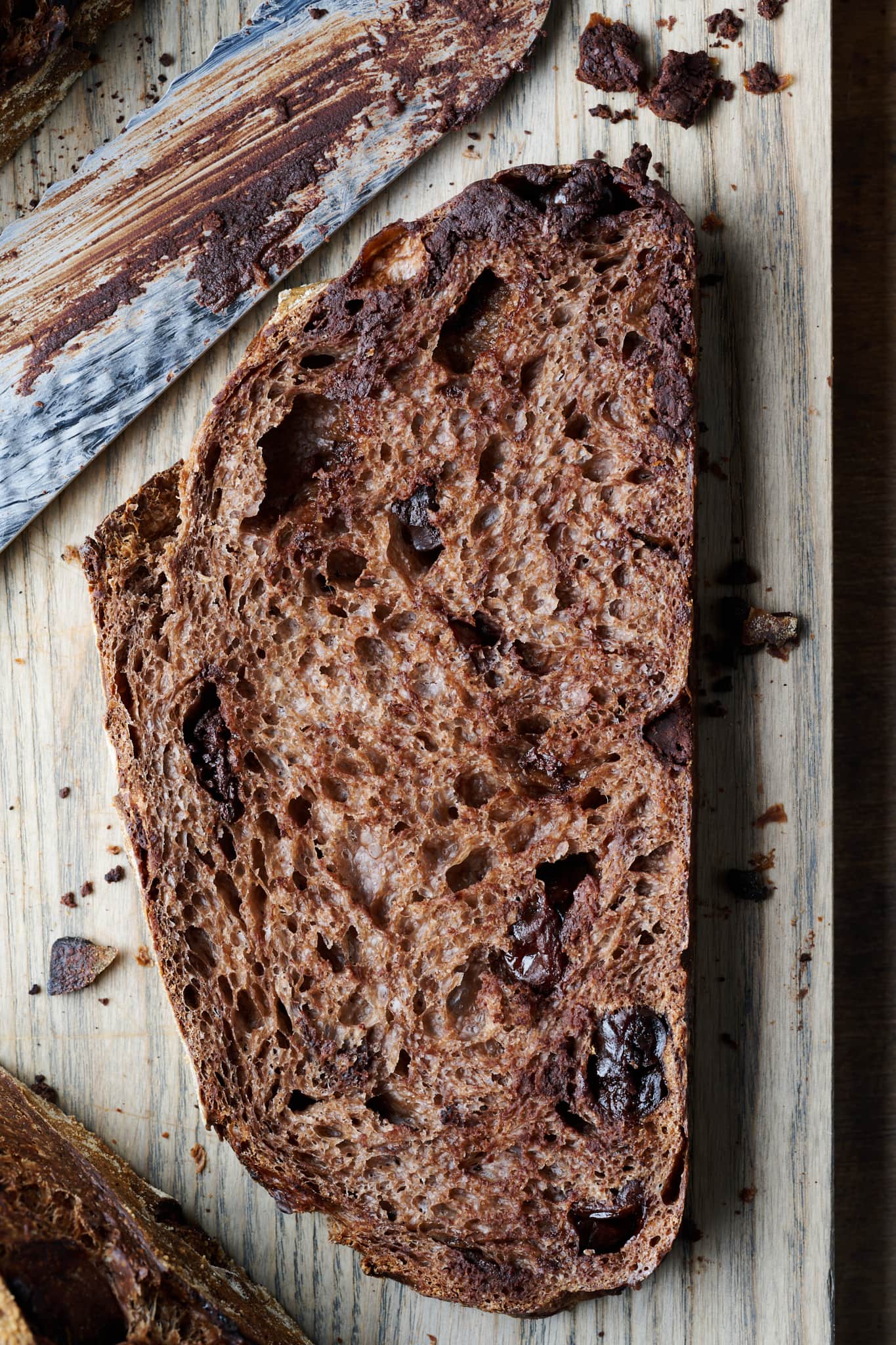 This rich, dark chocolate-cherry sourdough bread is deliciously menacing; like a chocolate bar, once unwrapped, it constantly demands attention. But before I started work on this recipe, I was skeptical. I wasn’t sure that adding a high percentage of chocolate would result in a pleasant-tasting loaf, given the hearty wheat and lengthy fermentation flavors. And, for me, large quantities of cocoa powder quickly become overpowering and bitter, and adding dark chocolate chunks seemed like it would only compound the issue.